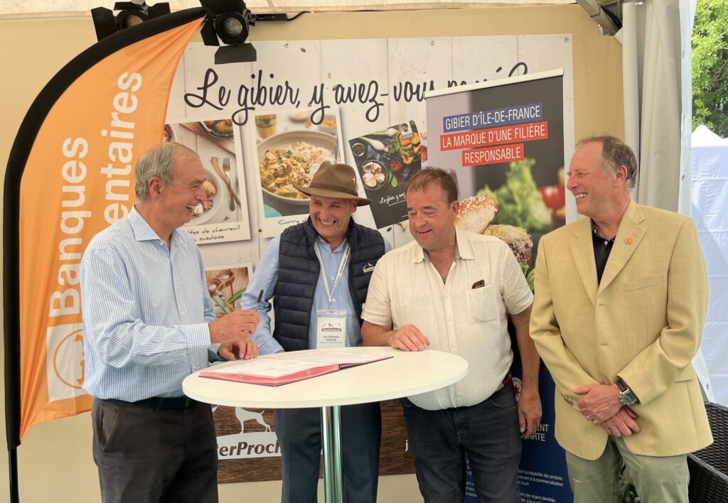 En photo, les signataires Jean-Christophe CHASTANG, Président d’InterProchasse, Benoît CHEVRON, Président de la Fédération Régionale des Chasseurs d’Ile-de-France et de la FDC 77, Philippe WAGUET, Président de la Fédération des chasseurs d’Île-de-France et Bruno JARRY, représentant de la Fédération Française des Banques Alimentaires
